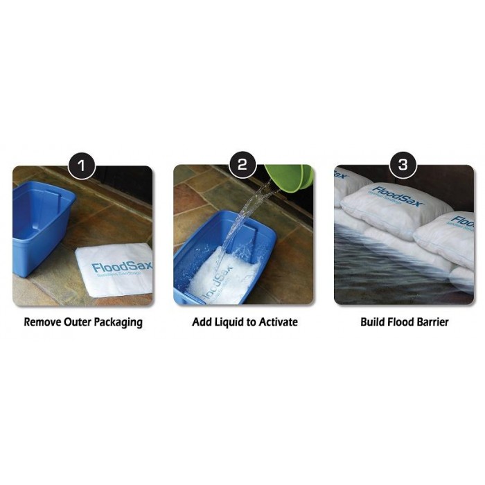 Το εσωτερικό του FloodSax αποτελείται από ένα ειδικά ανεπτυγμένο, απορροφητικό πολυμερές. Μόλις το FloodSax έρθει σε επαφή με το νερό, αυτό-ενεργοποιείται και μέσα σε λίγα λεπτά απορροφά 20-25 λίτρα νερού!