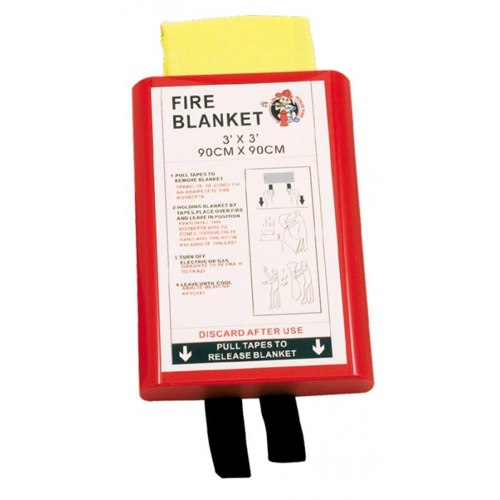 Πυρίμαχη Κουβέρτα, Άσπρη, 0,90 x 0,90m σε Σκληρή Θήκη, με αναγραφή ''ΠΥΡΙΜΑΧΗ ΚΟΥΒΕΡΤΑ'' & ''FIRE BLANKET'' και με οδηγίες χρήσεως στα Ελληνικά και Αγγλικά.